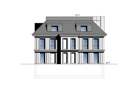 Es wurden zwei weitere Gebäude mit je 4 Wohnungen geplant. Die Architektur sollte sich hier an die klassischer Villen anlehnen. Den individuellen Abschluss bildet die Dachterrasse auf dem Walmdach.